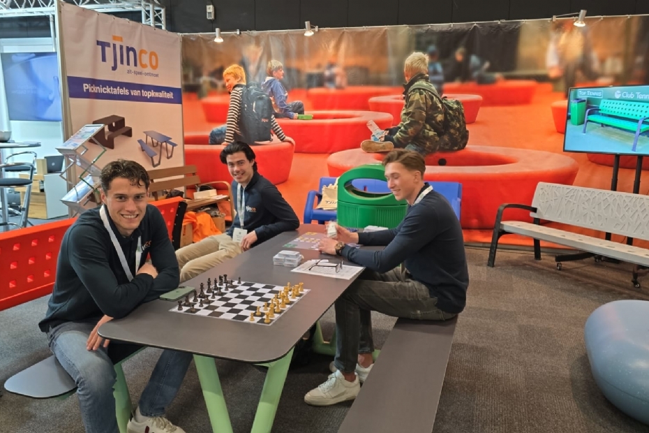 Matijs Harthoorn, Mathisse Tjin, Riley Meesters van Tjinco . Het bedrijf kan buiten- en binnenmeubilair leveren voor scholen, sportverenigingen en de buitenruimte.