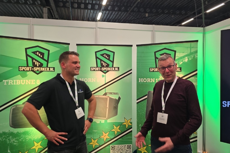 Jordy lLcht en Jelle Heeringa van Sport-Speaker.nl. 'Kunst van de speaker is de bediening simpel houden voor de vrijwilliger. Goed geluid is maatwerk.'
