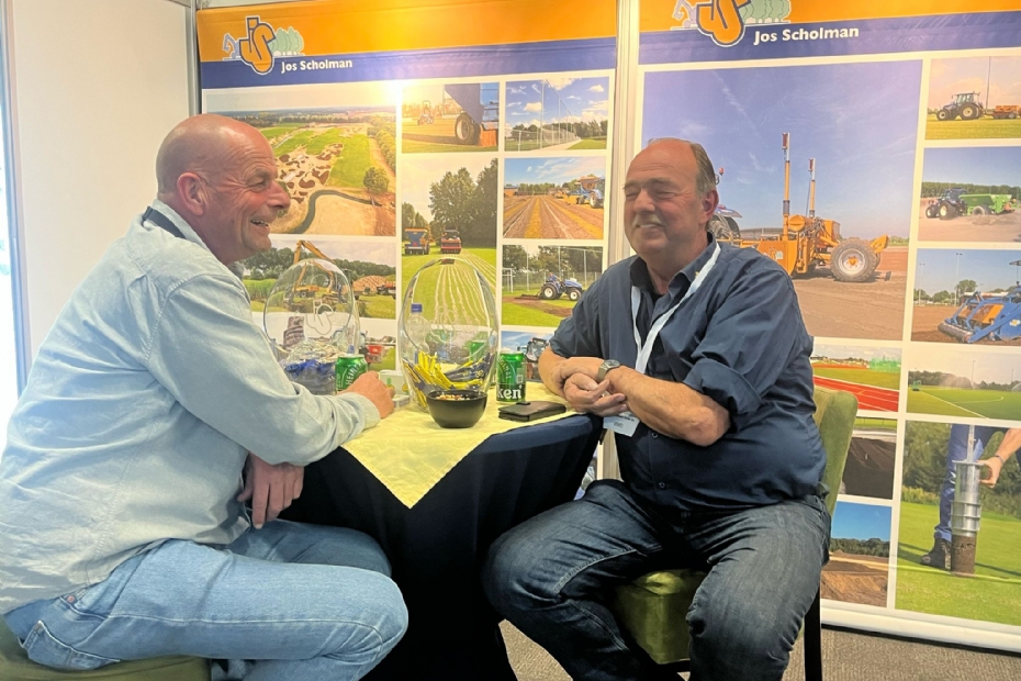Wilfred van Kippersluis en Erwin Pols van G.W. Pols Zn. BV. op de stand bij Jos Scholman. Wisselen anekdotes uit over succesvol beheer en onderhoud van sportvelden.