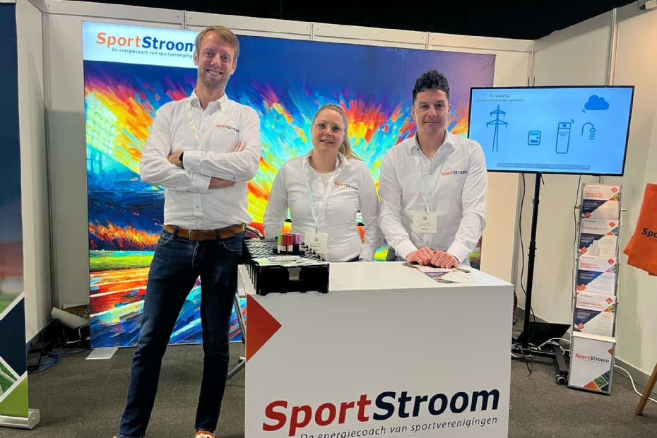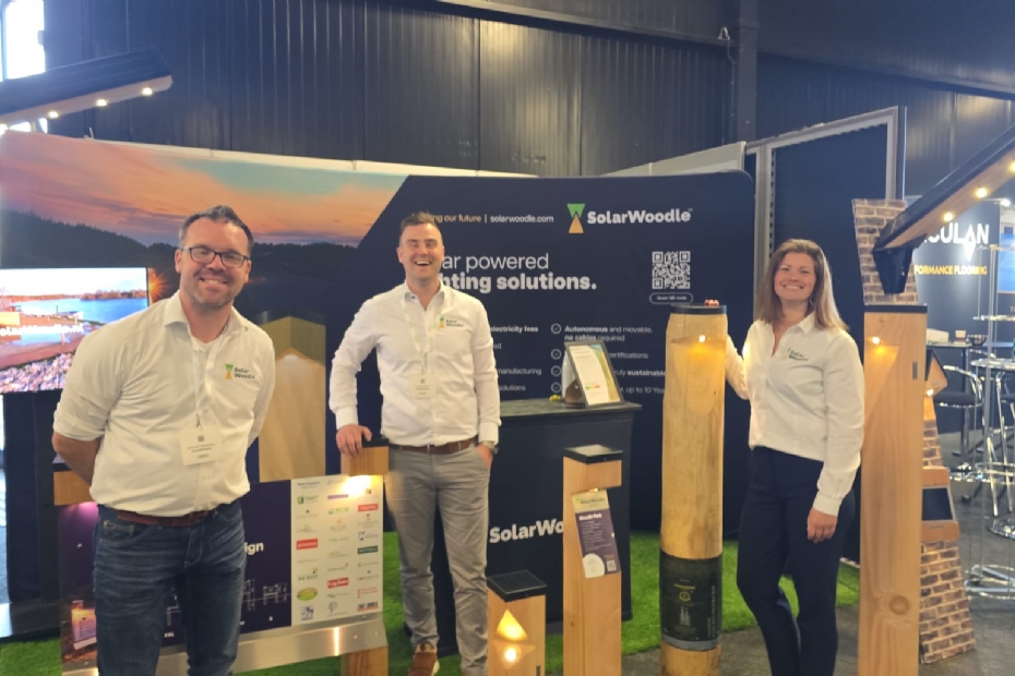 Bernard Wesseling, Levi de Groot en Karin van Beek van Solar Woodle staan voor het eerst op deze beurs, omdat sportparken ook duurzaam verlicht willen worden.