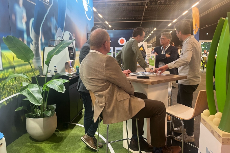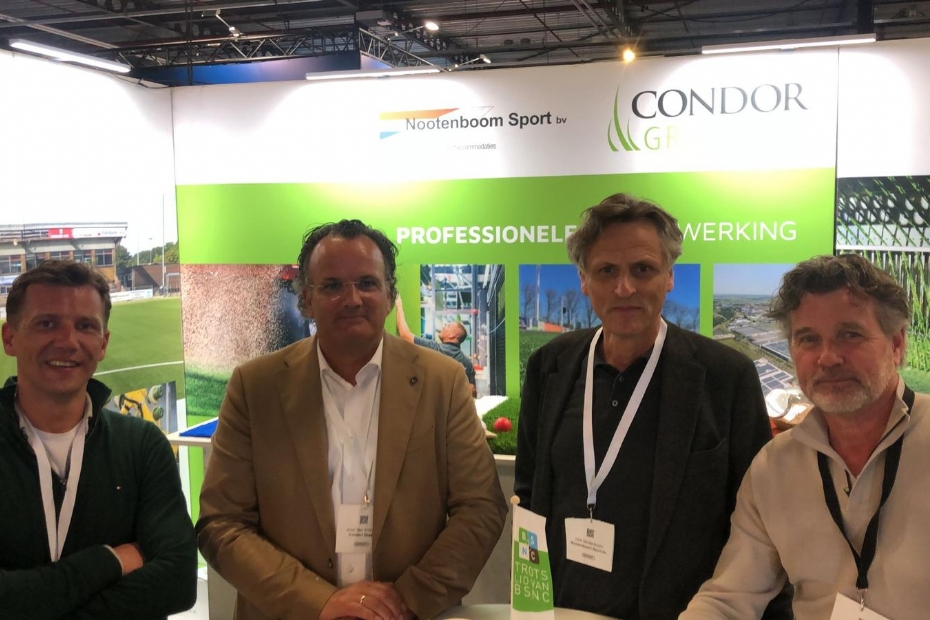 Joop van Krimpen van Condor Grass en Henk van de Zande en Dick Nootenboom van Nootenboom Sport bv bemannen samen een stand. Lauritsen van Alveo kwam even buurten.
