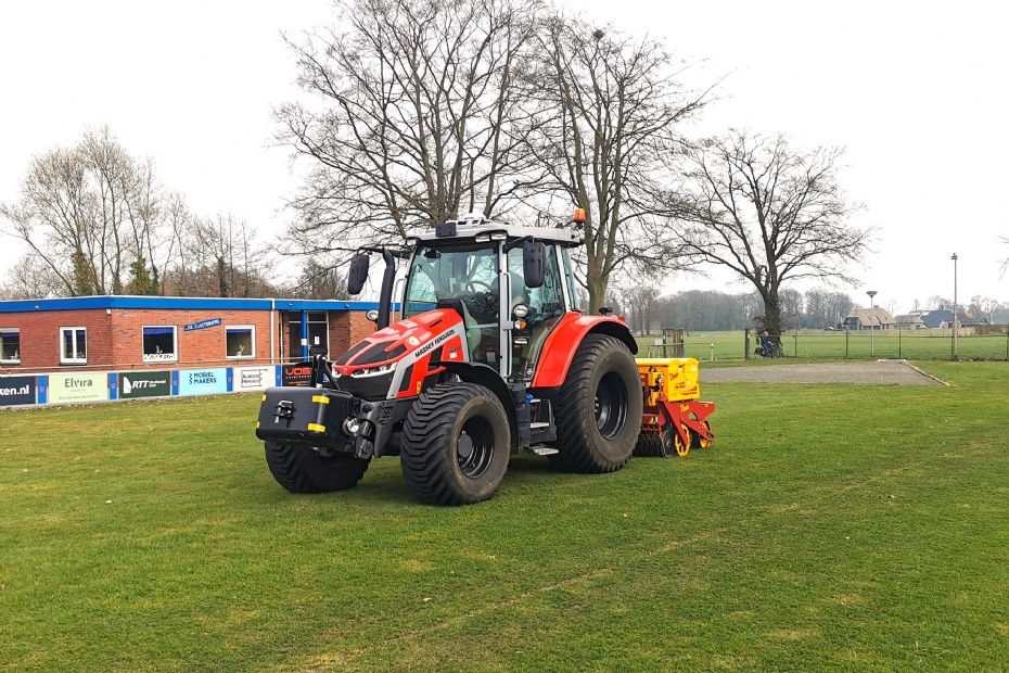 Gildebor heeft alle tractoren voorzien van gps-navigatie. 'Daardoor kunnen we zeer nauwkeurig werken. Door elke doorzaaironde in een andere richting uit te voeren, krijgen we een vollere mat.' Van Eerden vertelt dat zijn ploeg dit jaar in de tweede helft van maart begonnen is met de eerste doorzaaironde. Hij wijst op het gras op het binnenterrein van het Fanny Blankers-Koen Stadion in Hengelo. 'Begin juni vinden hier de 44e FBK Games plaats. Daar komen atletiektoppers vanuit de hele wereld op af. Om ervoor te zorgen dat het gras er tegen die tijd goed bij staat, hebben we dit de afgelopen winter al opnieuw ingezaaid. Eind maart stond er ondanks de lage temperaturen al goed gras.' Van Eerden koos bij deze klus voor tetraploïde Recover 4 Tetra-graszaad. 'Dat kiemt al bij lage temperaturen. Hier zie je het resultaat. Tetraploïde is nog iets relatief nieuws, maar je ziet de ontwikkeling doorgaan. De grassen worden steeds fijner en geven daardoor een mooier beeld.' Steunenberg is al jaren een warm pleitbezorger voor gras. 'Gras is een heel sterke plant die veel aankan,' zo merkt hij op. Van Eerden beaamt dat. 'De afgelopen paar jaar konden we al vroeg in het voorjaar doorzaaien. Dat scheelt tijd en werkzaamheden tijdens de zomerstop, maar het kan er ook toe leiden dat jong gras dat net opkomt uit het veld wordt getrapt. Toch maak ik me daar niet zoveel zorgen over; het gras slaat altijd wel weer aan.' Steunenberg wijst erop dat met name veldbeemd tijdens het zomeronderhoud moet worden doorgezaaid. 'Dat is een heel sterk, regeneratief gras. Omdat het in de breedte groeit, is het al snel goed geworteld. Zelfs als je bij de start van het nieuwe seizoen het opkomende gras uit het veld trapt, is er altijd wel ergens een stukje dat nog geworteld is en de open ruimte weer snel invult.' Om ervoor te zorgen dat het jonge gras een goede kans maakt, wiedegt Van Eerden de velden voordat hij begint met doorzaaien en zuigt hij het verwijderde oude gras weg. 'Daarnaast is het essentieel dat het veld regelmatig belucht wordt.'