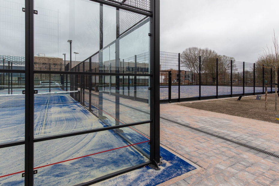 Met name de padelkooien zijn vanwege het gewenste multifunctionele gebruik anders geconstrueerd. Met behulp van TennisTotaal is gekozen voor een verstevigd geraamte dat geen trillingen veroorzaakt en dikker glas dat ook goed bestand is tegen bijvoorbeeld een voetbal. De opbouw van de onderlaag verschilt niet van reguliere velden. Ottenbros: 'Wij wilden aanvankelijk een betonnen wand in de padelkooien, zoals je veel ziet in Spanje, de bakermat van deze sport. Vanwege de lange levertijd en het permanente karakter van de wanden is dit idee losgelaten. De huidige wanden kunnen makkelijk worden gedemonteerd en verplaatst. Bij een betonnen wand zou dit een stuk lastiger worden.' Moes: 'In dit onderdeel hebben wij veel energie gestopt, met name aan de voorkant om aan alle sporttechnische eisen vanwege multifunctioneel gebruik te kunnen voldoen. Toen de betonwand niet doorging, moesten wij ervoor waken dat het niet vertragend zou werken op het hele proces.'