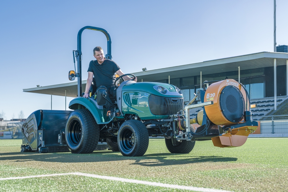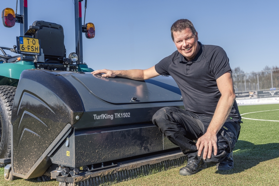 Filosofisch verklaart De Vet dat de factor 'tijd' het grootste onderscheid is tussen regulier onderhoud en dieptereiniging van een kunstgrasveld: 'Waar voor een oppervlakkige reiniging een uur volstaat, vergt een dieptereiniging aanzienlijk meer tijd. Maar dan haal je ook veel meer infill over de zeven.' Zoals te zien op de foto's, is de compacttractor uitgerust met een bladblazer. Deze foto's zijn gemaakt bij VV Oosterhout (NB.), waar De Vet eerder een rol speelde bij de aanbesteding en de aanleg van het kunstgras hoofdveld. Het blijkt dat de bladblazer vrijwel permanent aan de compacttractor gemonteerd is. 'Bij veel bladval, zoals in de herfst, is dat functioneel. Bij ons dient het ook als frontgewicht,' licht De Vet toe. 'Overigens vind ik de steeds kwetsbaarder uitgevoerde kunstgrasvelden een belangrijk aandachtspunt. De vezels maakt men steeds korter en lichter en dus kwetsbaarder. De hoeveelheid infill en het soortelijk gewicht van de infill neemt af. Te vaak zie ik beschadigingen ten gevolge van het gebruik van te zwaar materieel. Klein en licht materieel wringt veel minder. Wat dat betreft zie ik het beter afstellen van de machine op de kunstgrasmat als een belangrijk aandachtspunt. De SMG TurfKing TK1502 is, dankzij zijn lage gewicht, daarin een goede stap.'