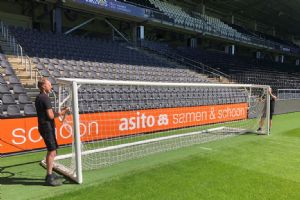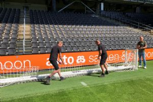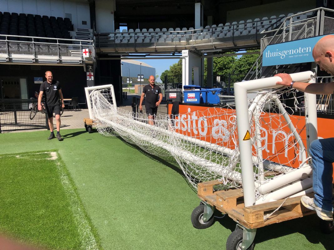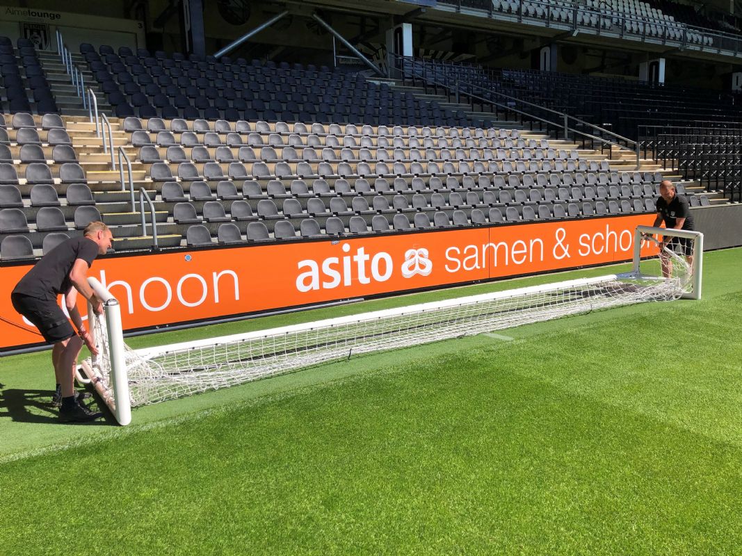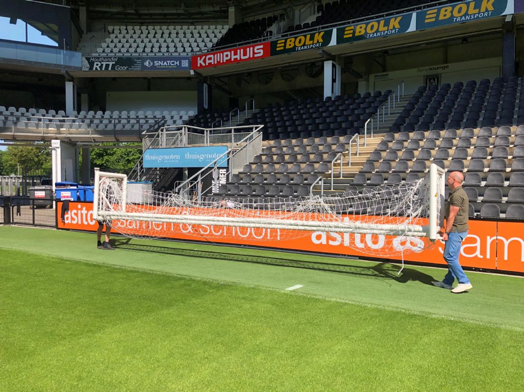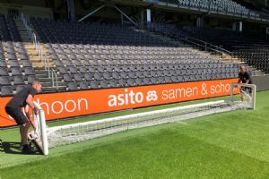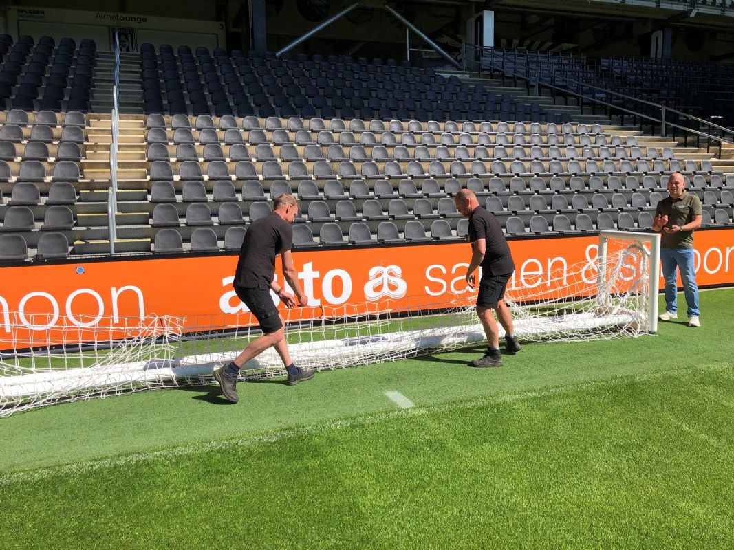 In het stadion van Heracles vertelt Jordy Scholten, mede-eigenaar van De Belijners, over deze toevoeging aan het assortiment van zijn bedrijf. 'Wij moesten twee jaar geleden bij FC Twente het veld belijnen voor een Europese wedstrijd en zagen dat fieldmanager Henry de Weert een inklapdoel gebruikte voor het inschieten van de keeper en dachten dat het wel handig zou zijn voor meer voetbalclubs, zodat zij hun vijfmetergebied tijdens de warming-up kunnen ontlasten.' Scholten weet namelijk ook dat in veel stadions er geen ruimte is om een niet-inklapbaar inspeeldoel te gebruiken. 'Je tilt zo'n doel niet makkelijk van het veld en er is vaak geen ruimte om het zodanig op te bergen dat niemand er last van heeft. Veel clubs willen wel hun doelgebied ontlasten, maar hebben domweg geen ruimte voor een extra inspeeldoel.'