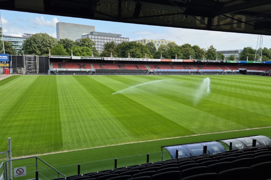 Toen Excelsior na het afgelopen voetbalseizoen rechtstreekse promotie naar de Eredivisie afdwong, wist de club dat het kunstgrasveld in het Van Donge & De Roo Stadion plaats moest maken voor het verplichte natuurgras. Om deze 1,5 miljoen euro kostende klus te klaren is een bouwteam samengesteld. Het bedrijf Grasmeesters was betrokken als onafhankelijke partij die veel ervaring en verstand heeft met en van gras om dit hele traject te coördineren en te begeleiden. 'Het voordeel van die directe promotie was dat wij al in mei konden starten', vertelt Hans Kok van Grasmeesters. Half juli ligt het stadionveld er dan ook al prima bij en zou er in principe al op gevoetbald kunnen worden. Bijkomend voordeel was dat Excelsior al in juli 2024 was gestart met de voorbereiding aangezien het los van wel of geen promotie de ombouw wilde realiseren.