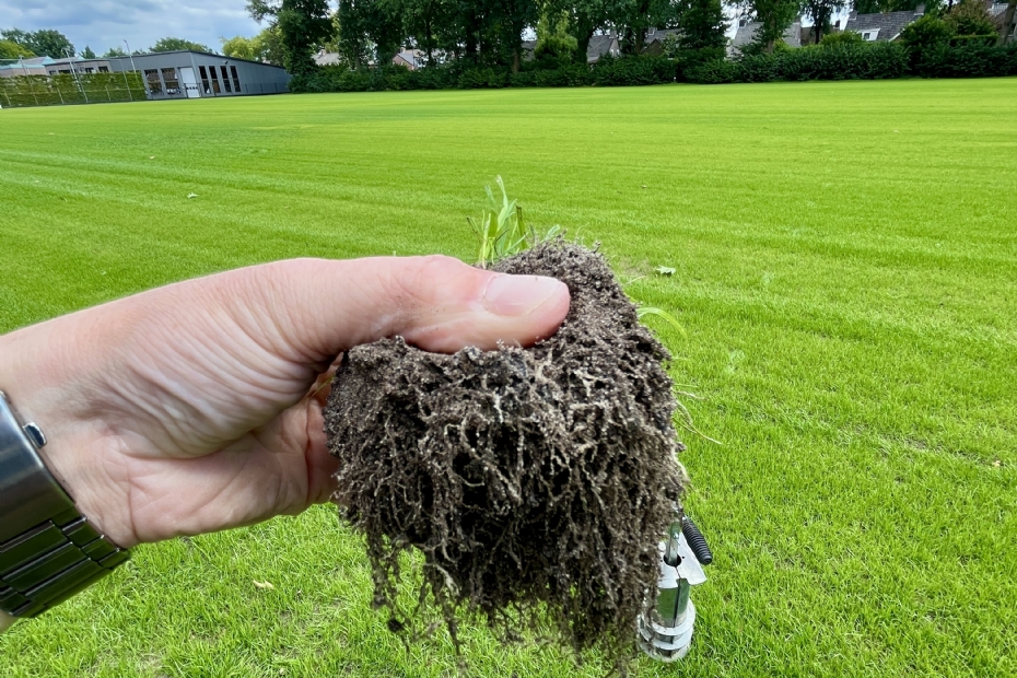 Het resultaat is er ook naar. Verstegen: 'Er ligt nu echt een strakke grasmat.' In principe is het veld twaalf weken na inzaai bespeelbaar. Toch adviseren de heren om de belasting zo lang mogelijk uit te stellen, zodat de wortels zich maximaal ontwikkelen. 'Wij proberen clubs altijd zover te krijgen om er een seizoen vanaf te blijven,' zegt Verstegen.