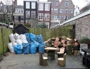 Het ging om een tweestammige es in een achtertuin aan de Keizersgracht. De bewoner had er voor gekozen om het hout en de houtsnippers zelf te behouden. In Amsterdam aan de grachtengordel heb je zelden een achterom. Om de versnipperaar door het huis achter te krijgen is deze bij de voordeur uit elkaar gehaald en in de tuin weer in elkaar gezet. Terugweg zelfde liedje.