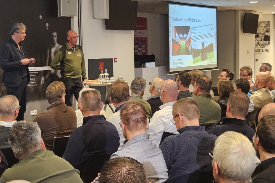 Job Steunenberg (Advanta Seeds) nam de zaal mee in het opkweken van de nieuwe grasmat voor PSV. Hij liet zien hoe vroeg in het proces al keuzes worden gemaakt op basis van data: van rassen die sterk blijven onder kunstlicht tot mengsels die passen bij de belasting van een topclub. De grasmat in het Philips Stadion komt uit een gecontroleerde teelt, waarbij temperatuur, licht en vocht per groeifase worden gestuurd. Steunenberg benadrukte dat dit geen 'standaardkweek' is: het doel is een wortelstelsel dat meteen draagkracht heeft, zodat het veld de eerste trainingsweek al tegen een stootje kan. Uit het publiek kwam de vraag of deze intensieve opkweek ook leidt tot minder problemen in het seizoen. Volgens Steunenberg helpt een sterke start, maar bepaalt vooral het daadwerkelijke gebruik hoeveel voeding en herstelwerk tijdens het jaar nodig is. 'We kunnen een mat afleveren die klaar is voor topniveau, maar daarna neemt de praktijk het over', zei hij.
