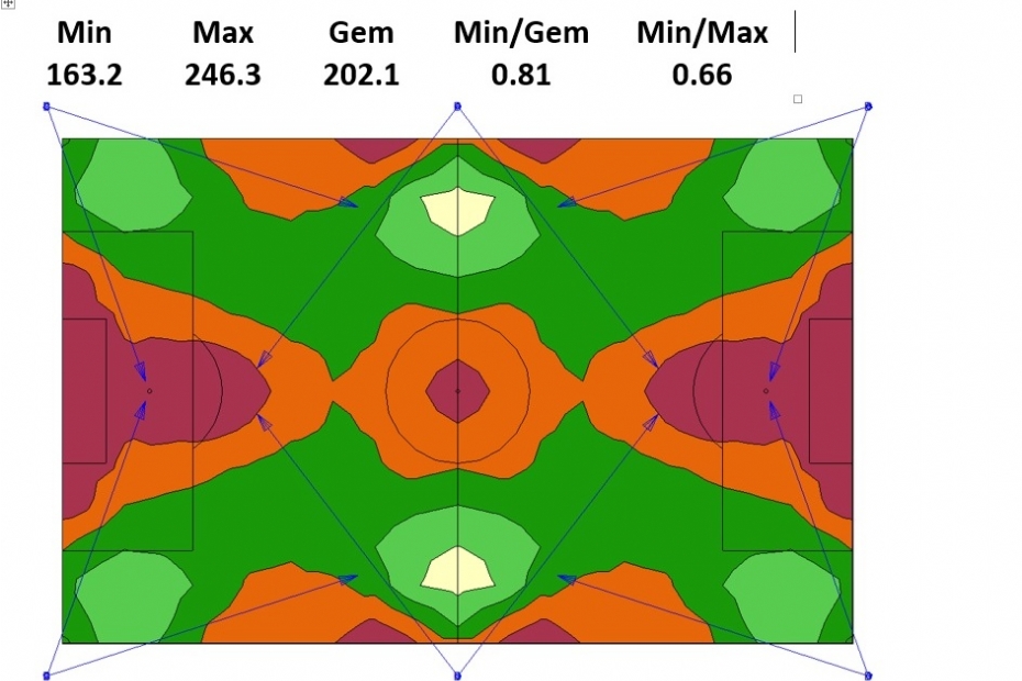 We hebben twee lichtplannen voor een voetbalveld, die allebei ruimschoots voldoen aan de nieuwste eisen: lichtplan A met een rekenraster van 19 x 13 punten.