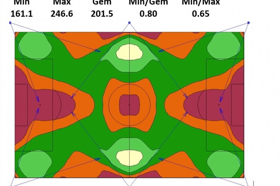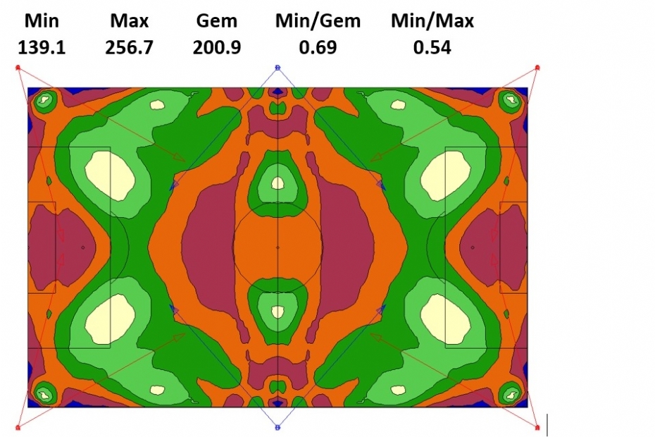 De ontwerpsoftware kan meestal een met verschillende kleuren gevuld isolijnendiagram maken. Dit geeft een mooi visueel beeld van de verdeling van het licht over het veld. Hieronder volgen enkele voorbeelden. Aangezien het spel het meest in het midden van het veld plaatsvindt, hebben we de donkerste plekken liever aan de rand van het veld dan in het midden. Idealiter liggen de donkerste en lichtste plekken niet vlak naast elkaar (dat kan eventueel in een gradiënt uitgedrukt worden). Met een gevuld isolijnendiagram kunnen dergelijke aspecten visueel beoordeeld worden. De kwaliteit van de verlichting is moeilijk in een paar getallen te vangen. Een gevuld isolijnendiagram geeft een genuanceerder beeld dan alleen Emin : Egem of Emin : Emax.
