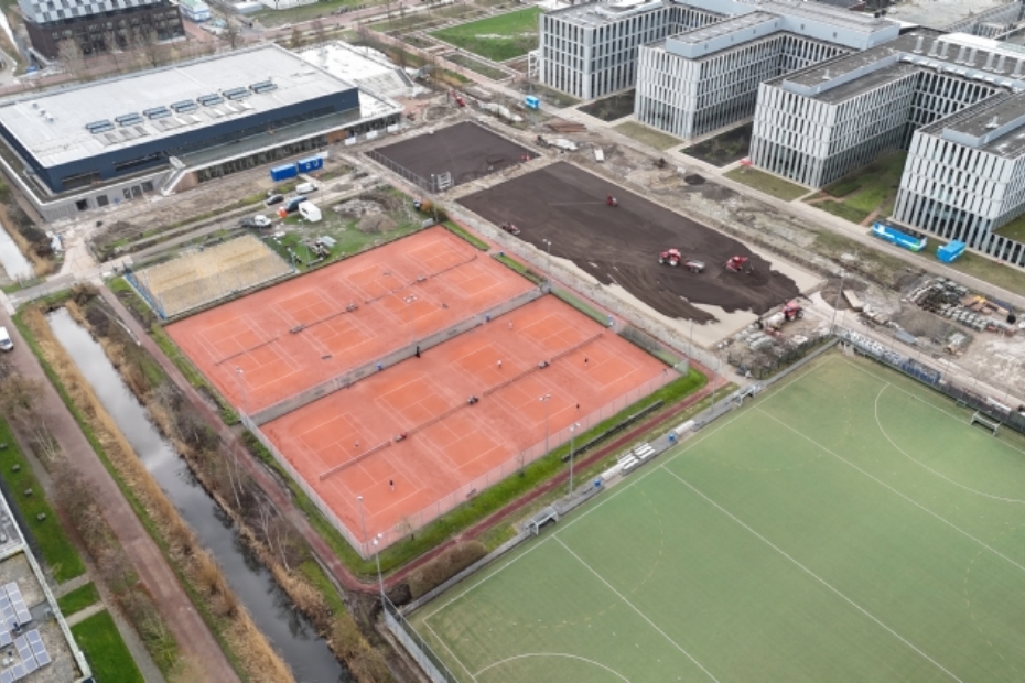 Tussentijdse droneopname van fase 1 - aanleg nieuwe tennisbanen op het buitensportcomplex Universitair Sportcentrum Leiden