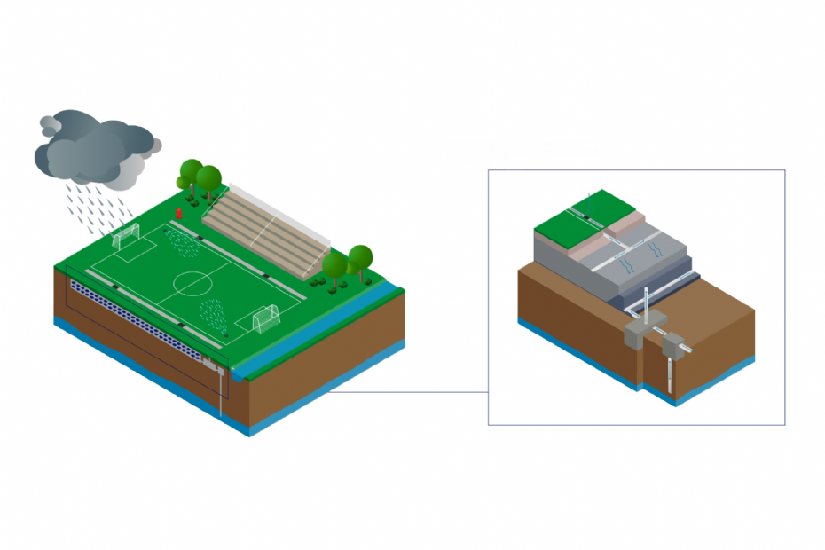 Als het gaat om de problematiek die ontstaat door de opwarming van de aarde, ziet Ger Pannekoek, directeur bij EWB, in sportaccommodaties een kans die gemeenten kunnen aangrijpen. 'Sportaccommodaties bieden ruimte om het omliggende systeem te ontlasten. Water dat nu via het riool naar de zuivering gaat of waarvoor in hemelwaterstelsels geen ruimte is, kan op een sportpark worden opgevangen en verwerkt. Dan gaat het niet alleen om het water voor het sportpark zelf, maar ook voor de omliggende wijk.' De oppervlakte is er. Sportparken liggen vaak naast wijken of bedrijventerreinen met een grote wateropgave. En anders dan parken of pleinen zijn ze relatief eenvoudig aan te passen zonder dat bewoners er dagelijks hinder van ondervinden. 'Er is ruimte en onbenut potentieel', zegt Pannekoek. 'Zowel boven als onder de grond.' Hugo Heitmeijer, projectmanager bij Antea Sport, herkent dat beeld. 'Door sportparken te voorzien van waterzuiverings- en opslagoplossingen, geven we een antwoord op waterproblemen in de verharde omgeving.'