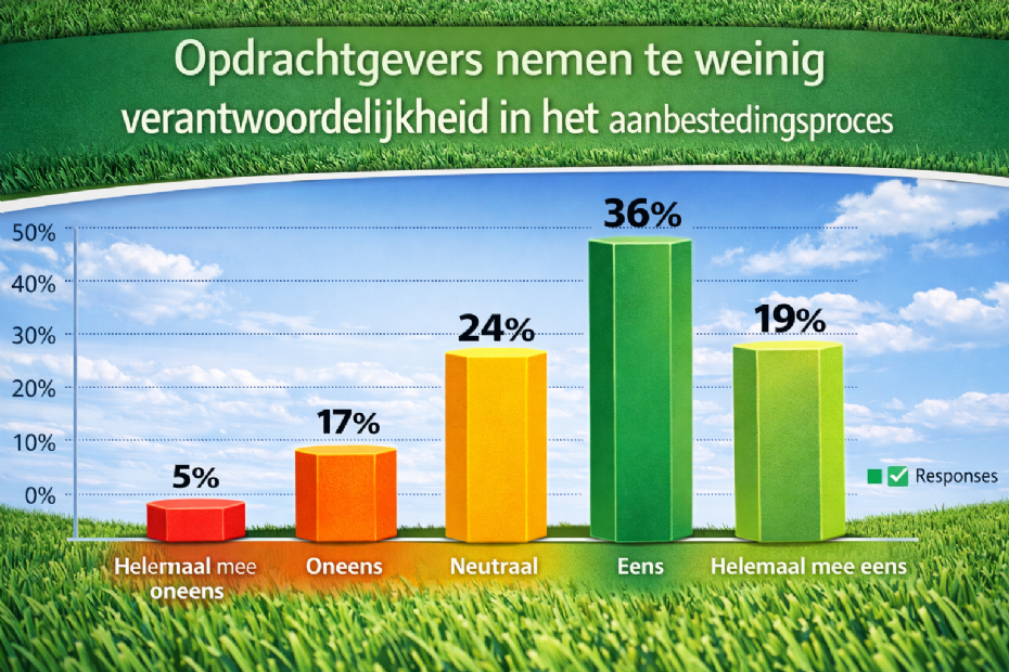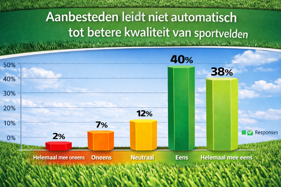Op het gebied van kwaliteit is de uitkomst nog uitgesprokener. Een ruime meerderheid van 77,5 procent vindt dat aanbesteden niet automatisch leidt tot betere sportvelden. Slechts tien procent is het daar niet mee eens, terwijl 12,5 procent neutraal blijft. Veel respondenten ervaren dat aanbestedingen sterk worden gedomineerd door prijs en procedure, terwijl factoren als vakmanschap, materiaalkeuze en duurzaamheidsambities uiteindelijk bepalend zijn voor het eindresultaat. De vraag dringt zich op in hoeverre de huidige aanbestedingssystematiek voldoende ruimte biedt om deze inhoudelijke kwaliteit te borgen.