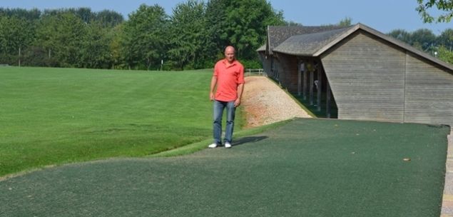 En die hobbels´ zijn bewust in deze groene kunstgras afslagmat verwerkt. Deze afslagmat heeft ondulaties, zodat golfers hun afslag naar wens kunnen oefenen vanaf schuine vlakken, in alle richtingen. Desgewenst kan een tee in het kunstgras geprikt worden. Deze innovatie toepassing van een stukkie kunstgras op de golfbaan werd geleverd door Duchell. Directeur Ton Blasse van Golfpark Wilnis poseert hier even achter de grootste ´hobbel´. De mat heeft ook vele kleine hobbeltjes. Op de foto zijn deze niet zichtbaar, maar ze geven deze driving range wel een extra dimensie.