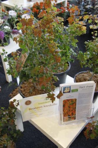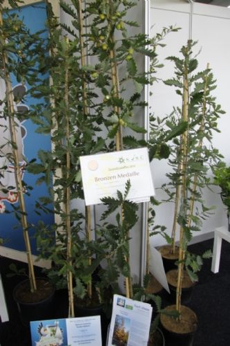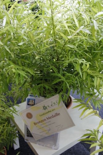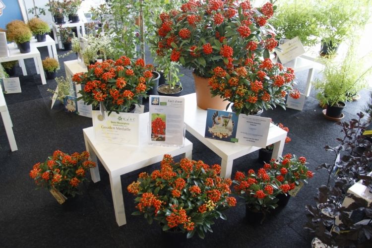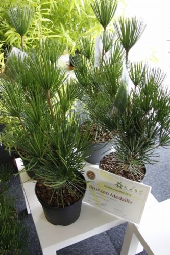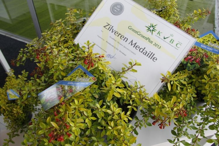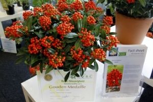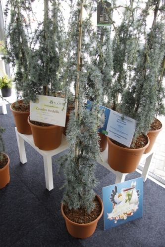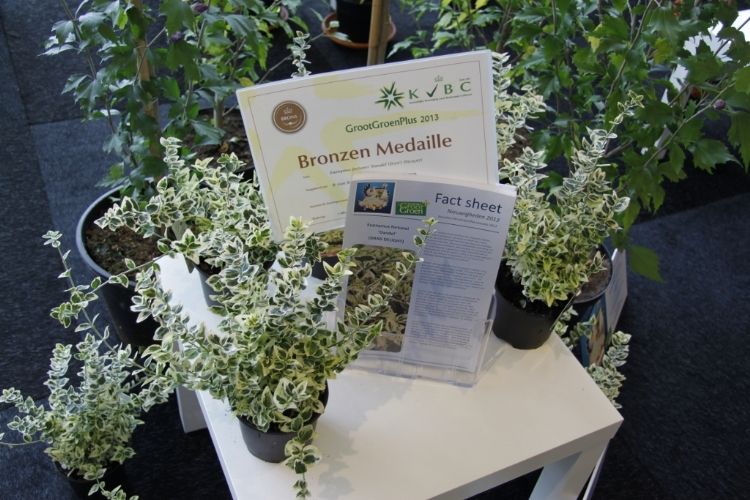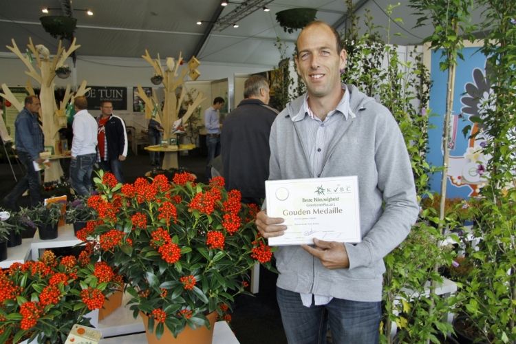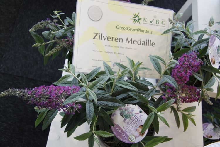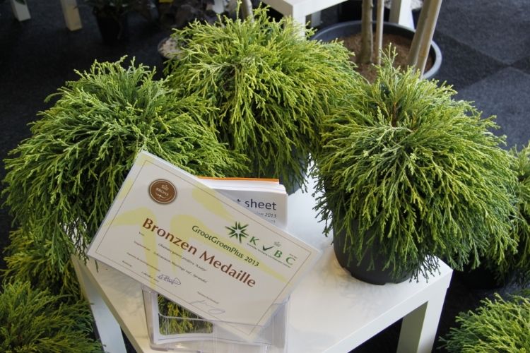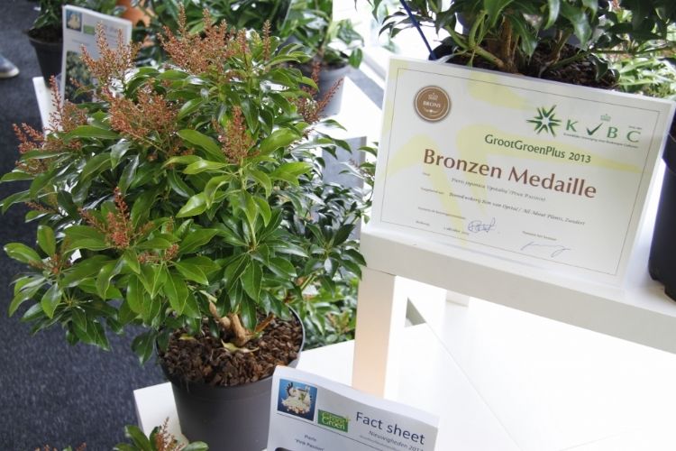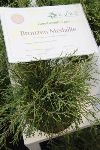 Over de winnaar Skimmia japonica 'Pabella' oordeelde de jury: 'Schitterend gevormde planten, ook de jonge planten; bessen in een aangenaam warme kleur rood, zeer rijk gedragen en goed boven het loof zichtbaar; prima verbetering in het sortiment.' Over de Cedrus zei de jury: 'Verbetering van 'Glauca Pendula'; de naalden zijn blauwer, de plant heeft een betere vertakking en de twijgen en harttak zijn minder stug waardoor de plant beter te vormen is en slanker zal blijven.' De zilveren medaille was er voor: * Buddleja 'Purple Haze' (PURPLE CHIP), inzending van Valkplant uit Boskoop: 'De brede groeiwijze met overhangende twijgen maken deze Buddleja tot een goede bodembedekker; de bloemtrossen zijn groot en mooi gekleurd; het blad is goed dicht zodat een gesloten plant ontstaat.' * Escallonia 'Alcaura' (GOLDEN CARPET), inzending van Boomkwekerij Elst uit Wernhout: 'Opvallende combinatie van geel loof en rode bloemen; visueel een zeer sterk product; zeer geschikt als potplant.' Een bronzen medaille was er voor: * Acer 'Ample Surprise' van Boomkwekerij Bömer (Zundert): 'Mooie roodbruine jonge scheuten en een mooie bladstructuur door de scherp gelobde bladeren; Leuke struik die ook 's winters donkerrood gekleurde twijgen heeft.' * Chamaecyparis pisifera 'Kaatje' van Schrauwen-Moerings (Sprundel): 'Vrij dikke, stevige twijgen: het loof heeft een leuke kleur; is een verbetering van 'Sungold' en zal deze stilzwijgend van de markt kunnen gaan verdringen.' * Euonymus fortunei 'Dandel' (DANS DELIGHT) van B. van Roessel Tuinplanten (Haaren): '"Witter" loof dan andere bontbladige Euonymus; daardoor een frisse verschijning.' * Microbiota decussata 'Filip's Siberian Beauty' van Edwin Smits Conifers (Volkel): 'Opvallend afwijkend in het sortiment; goed gevulde planten.' * Pieris japonica 'Opstal69' (PINK PASSION) van Boomkwekerij Ron van Opstal / All About Plants (Zundert): 'Zeer bossige planten, uitzonderlijk voor een roze-bloeiende Pieris; sterk; helaas (nog) niet in bloei.' * Quercus 'Garden Brilliant' van Van Aart Boomkwekerijen (Oudenbosch): 'Sterk groeiend, opgaand maar niet al te breed; opvallende en fraaie badvorm, mooi donkergroen blad.' * Salix udensis 'Golden Sunshine' van Pépinières Minier (Beaufort, Frankrijk): 'Frisse loofkleuren; zelfs de bladeren onderin de plant zijn groengeel.' * Sciadopitys verticillata 'Eiffel Tower' van Sprenkels (Achtmaal): 'Unieke stand van de naalden; mooi gekweekte planten met goed donkergroen (gezond) loof.' De nieuwigheden zijn beoordeeld door de keuringscommissie van de KVBC. Volgens KVBC-secretaris Ronald Houtman was de kwaliteit van de inzendingen zonder meer goed, maar is meer aandacht geboden voor de presentatie van de planten. Alle medaillewinnaars zijn te zien in onderstaande fotoreportage. Foto's: Vakblad Boom in Business/Ruud Jacobs
