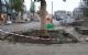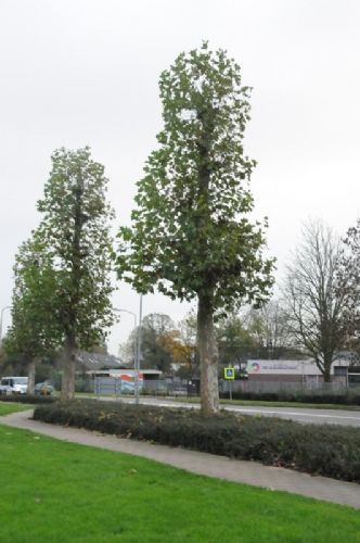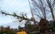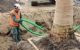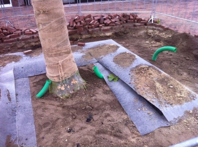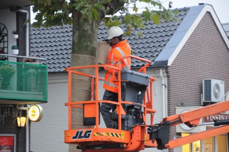 Stam van de boom wordt omwikkeld met jute tegen zonnebrand