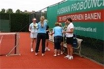 Doordat wij dagelijks op tennisbanen en hockeyvelden zijn, hebben wij alle ontwikkelingen van nabij gevolgd. Door te spreken met de gebruikers en groundsmannen wisten wij al snel dat er nogal wat verbeterd kon worden aan de nieuwe baansoorten. Dit heeft ons doen besluiten een geheel eigen baansoort te ontwikkelen: De Huisman Probounce. HUISMAN PROBOUNCE, DE VIERSEIZOENENBAAN Tennisen op gravel voelt voor een ieder vertrouwd. Een nadeel is dat het seizoen nooit langer dan max. 7 maanden duurt. Een gravelbaan is gevoelig voor weersinvloeden als regen, bevriezing en daarna de opdooi. Probounce banen zijn niet gevoelig voor al deze weertypes, men kan het hele jaar doorspelen. Zelfs tijdens de wintermaanden houdt Probounce haar maximale speeleigenschappen. Probounce is de droombaan voor iedere vereniging, het hele jaar door bespeelbaar. Speeleigenschappen die aan de eisen van de gebruiker voldoen en altijd dezelfde gelijkmatige balstuit. Geen beregening, geen voorjaarsbeurt, onderhoudsvriendelijk, gewoon 12 maanden spelen. Probouncebanen zullen onder de moeilijkste omstandigheden aan uw eisen voldoen. De Probounce-constructie wordt aangelegd op een lavafundering wat de doorlaatbaarheid onder alle omstandigheden garandeert. De Probounce toplaag kan ook op een gebonden ondergrond worden aangelegd. Mateco, beton of asfalt, u creëert in een keer een dempende toplaag met sublieme speeleigenschappen. Probounce heeft speeleigenschappen die het vertrouwde gravel bijna evenaren. Lopen, draaien, glijden zijn vergelijkbaar. Probounce heeft veel voordelen, banen zijn onder alle omstandigheden bespeelbaar. Probounce banen zijn als enige niet gevoelig voor regen, vorst en opdooi. Dit is mogelijk door het snel drainerende vermogen van de Probounce-constructie, ook na jaren intensief gebruik. De volgende verenigingen hebben al gekozen voor de Huisman Probounce banen Tennisvereniging Oudegein in Nieuwegein Zeven Huisman Probouncebanen Universiteit Leiden zeven banen Probounce Tennisclub Zwaanshoek negen banen Probounce Tennisvereniging Lisserbroek Zes banen Huisman Probounce LTC Lisse Zes banen Huisman Probounce In aanbouw: Lemelerveld vijf banen Huisman Probounce In aanbouw: Tennisvereniging Sikkens, Sassenheim vijf banen Huisman Probounce In aanbouw: Tennisclub Bosschenhoofd Drie banen Huisman Probounce Ten-Boer Vier banen Huisman Probounce nieuw park ATC Almere Vier banen ombouwen naar Huisman Probounce Tennisvereniging Klaverpolder twee outdoor Probounce-banen SV Voorhout Acht gravelbanen ombouwen naar Probounce. Tennisvereniging Hoogerheide Hilversum 2 banen Huisman Probounce toplaag. Tennis Club Woerden5 Huisman Probouncebanen. Kaagse tennisclub Kaageiland op Huisman Probounce banen Klundert vier Probounce-banen Door de hoge eisen die zijn gesteld aan de stabiliteitsmat en het infill materiaal behoeven de banen een minimum aan dagelijks onderhoud. De banen behoeven niet na elke partij te worden gesleept wat irritatie voorkomt en snel wisselen van partijen mogelijk maakt. De banen behoeven geen beregening wat kostenbesparend werkt, discussie voorkomt en geen spelbreker hoeft te zijn tijdens competitie en toernooien. HOE IS EEN HUISMAN PROBOUNCEBAAN OPGEBOUWD? De Huisman Probouncebanen bestaan uit een stabiliteitsmat waarvan de polen een hele dichte bezetting hebben. De polen met een lengte van 13 mm staan rechtop in de mat en geven door het grote aantal per vierkante centimeter al een goede stabiliteit. De mat heeft geïntegreerde goed zichtbare belijning van het zelfde materiaal. Door deze mat in te strooien met een ronde rode keramische korrel (10 kg per m2) krijgt deze de uitstraling en eigenschappen van een gravelbaan waar men gewoon op kan glijden en valt de baan in de catagorie "medium fast" Door de dichtheid van de polen is er weinig infill materiaal nodig voor de stabiliteit, mede daardoor blijft deze toplaag goed waterdoorlatend. De banen behoeven geen beregening en behoeven niet na elke partij te worden gesleept. De Huisman Probounce tennisbanen kunnen worden uitgevoerd in zowel gravel look, als groen/groen. Kijk voor meer informatie op www.huismanprobounce.nl.