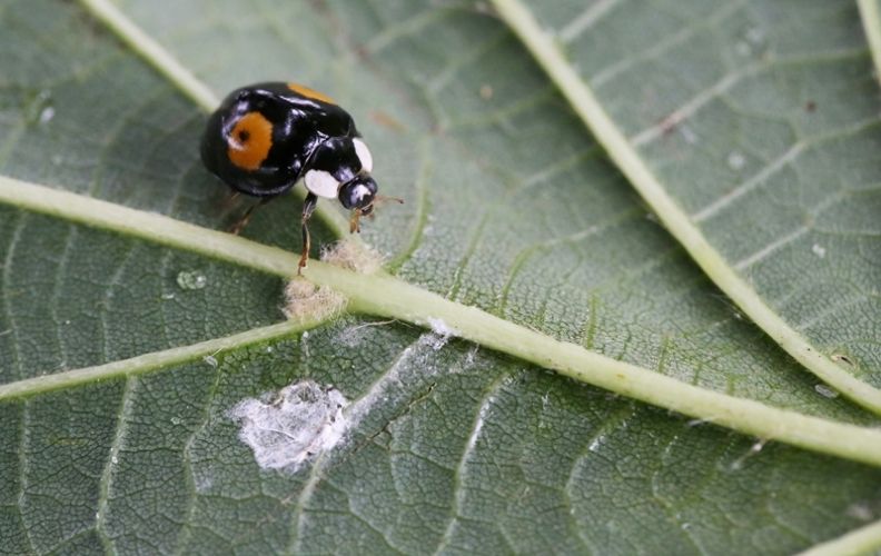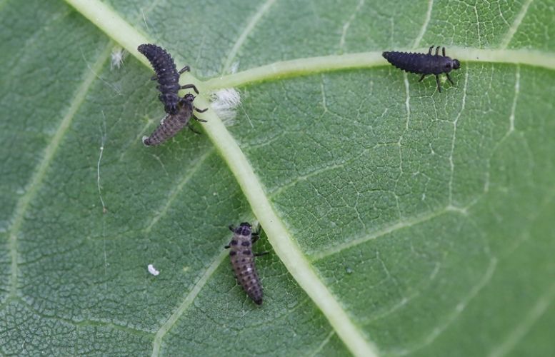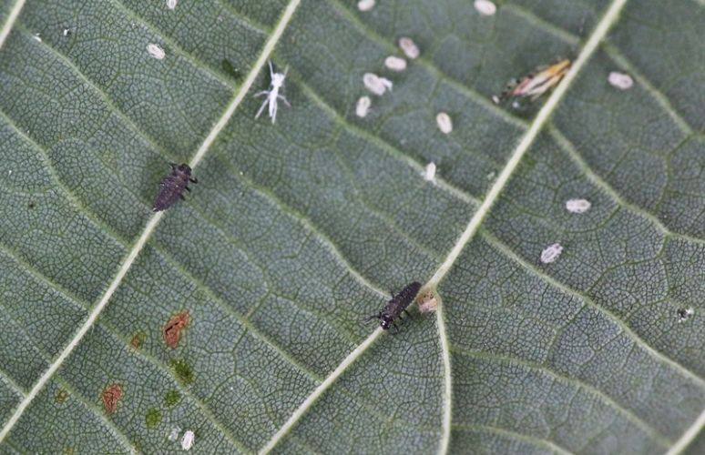 De larven worden onmiddellijk actief en gaan direct op zoek naar (blad)luizen. De lichte bolletjes op het blad zijn jonge lindeluizen, Eucallipterus tiliae.