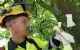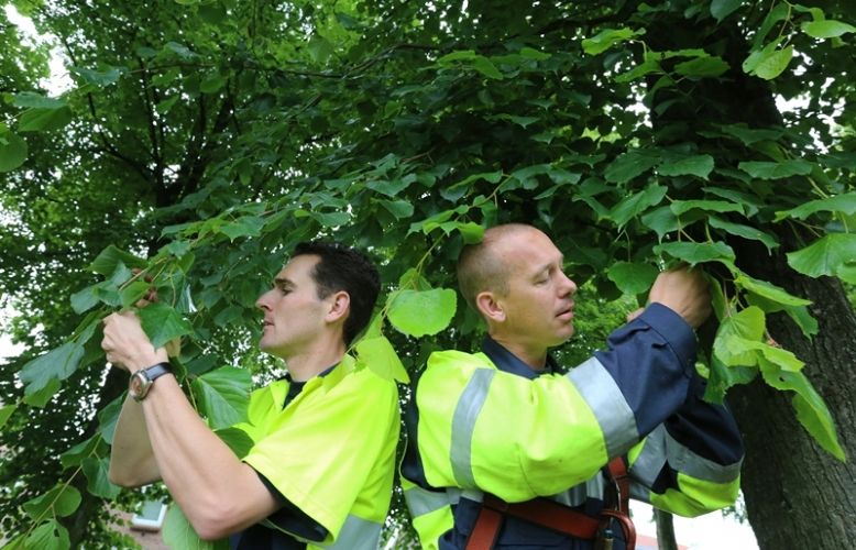 Edward Verhoeve(rechts) en Bram Den Hollander inspecteren de lindebomen op natuurlijke vijanden en de populatie luizen. In het hart van de bomen is al wat honingdauw aanwezig, de hoogste tijd dus om extra larven in te gaan zetten.
