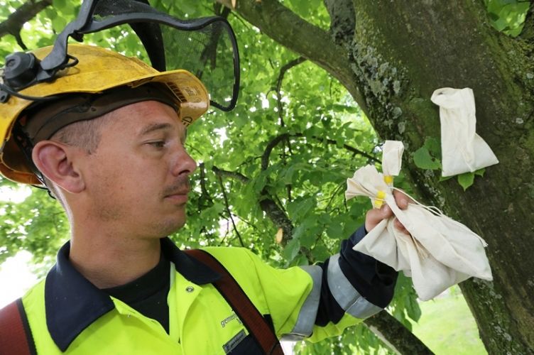 De zakjes met daarin elk 100 larven worden open gemaakt en in de boom gehangen. “We hangen op deze locatie al meerdere jaren zakjes met larven van Adalia bipunctata in de bomen. We zien ook een afname van de overlast over de jaren heen. Je kunt dus wel stellen dat jaarlijks inzetten helpt de overlast te reduceren” aldus Edward Verhoeve.