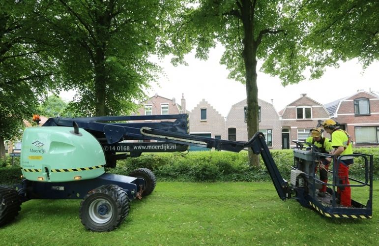 Aan de Prins Hendrikstraat in Zevenbergen staat de hoogwerker van Gemeente Moerdijk klaar om zakjes met larven in de lindebomen te hangen.