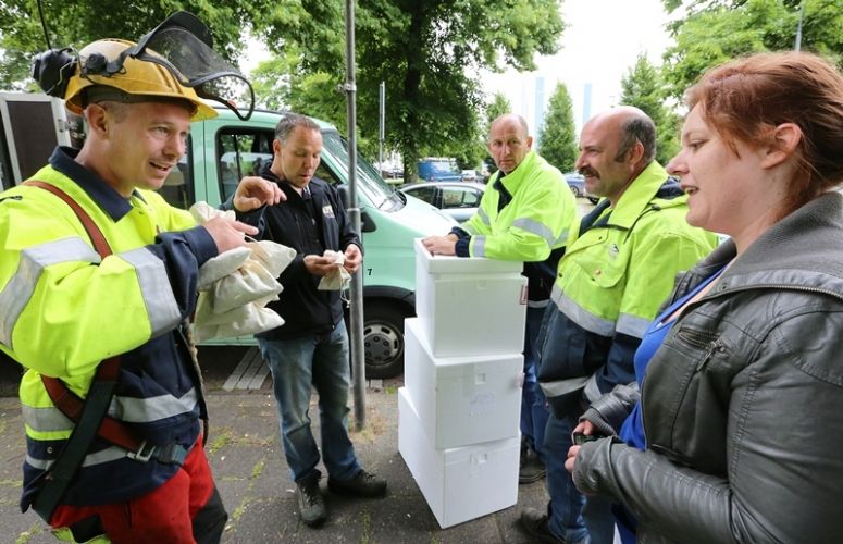 Tijdens de uitleg door Dirk de Jong van aan de bomenploeg van gemeente Moerdijk komt een nieuwsgierige passant even kijken naar de lieveheersbeestjes. Ed Verhoeve geeft met zijn handen aan hoe groot de larven kunnen worden…