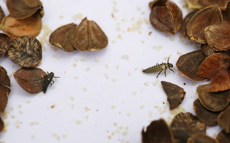 Zodra de dozen met daarin de zakjes worden opengemaakt is er een eerste snelle visuele inspectie. Je ziet de larven direct actief worden en al op zoek gaan naar bladluizen.