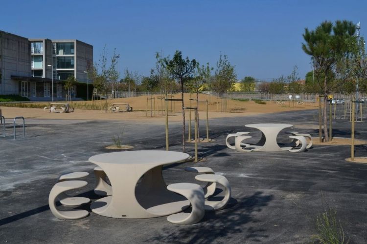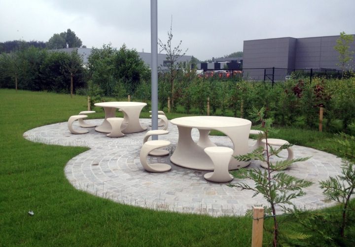 Beide picknicksets zijn afkomstig uit de Slimconcrete collectie en brengen de bewegingsvrijheid in beeld. De sets zijn gemaakt van UHPC beton. In Nederland wordt dit materiaal Ultra Hoge Sterkte Beton genoemd. Ontwerpers en architecten kunnen met dit materiaal experimenteren met fragiel ogende constructies in complexe vormen. Die toch uiterst sterk zijn. Deze flexibiliteit levert verrassende invalshoeken op voor een hele reeks nieuw meubilair. De herkomst van dit materiaal ligt in de bouwindustrie. Hier werd het al gebruikt voor o.a. gevels en steeds slankere en grotere brugoverspanningen. De wapening en het beton vormen één mengsel. Het produceren van ingewikkelde wapeningsnetten is hierdoor niet meer noodzakelijk en dat vereenvoudigt de productie van meer complexe vormen. De Grasshopper is ontwikkelt als buitenmeubilair voor een werkplek of zithoek. De Odos is ontwikkelt als buitenmeubilair voor onderwijsinstellingen maar kan ook op andere locaties in de buitenruimte gebruikt worden. Door het geringe gewicht zijn ze ook geschikt om bij daktuinen toe te passen.
