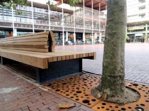 Aan de rand van het stadsplein in Amstelveen zijn de Beethoven banken toegepast. De Beethoven banken hebben een robuuste uitstraling en zijn tegelijkertijd ook elegant. De rugleuning heeft een sierlijke vorm die voor zowel kinderen als volwassenen een prettige ondersteuning biedt. In het verlengde van de gekoppelde bankopstellingen zijn CorTen Boomroosters toegepast. Deze bieden bescherming aan de groeiplaats van de bomen en accentueren de randen van het plein.