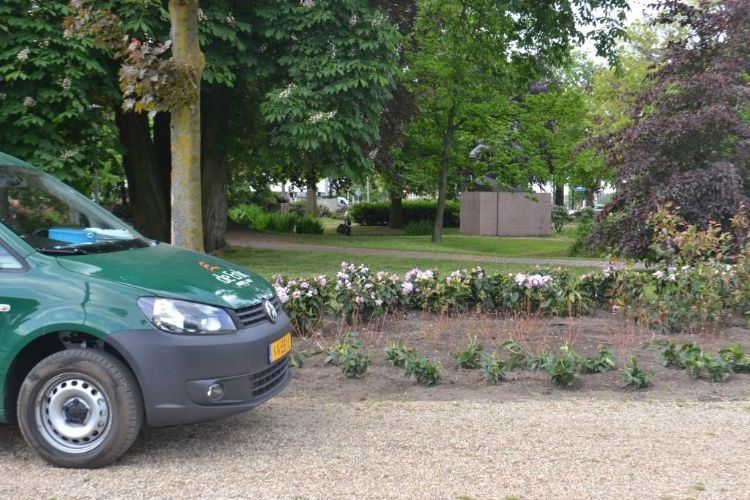 Meerjarige planten Scheerder laat de tekening zien waarop de aanplant schematisch is weergegeven. Buro Mien Ruys heeft voor de herinrichting van dit groen een ontwerp gemaakt op basis van Zorgeloos Groen, een concept van de Enk, Buro Mien Ruys, Boot & Co en Lageschaar, dat inzet op kwalitatief en kleurrijk groen dat om weinig onderhoud vraagt. In het kader van dit concept worden de randen van het parkje dit jaar, na jaren van éénjarige aanplant, voorzien van duurzame meerjarige beplanting. De groenvakken zijn voorzien van nieuwe buitenborders, er zijn jonge taxusstruikjes aangeplant, en in de aarde staan diverse jonge plantjes.